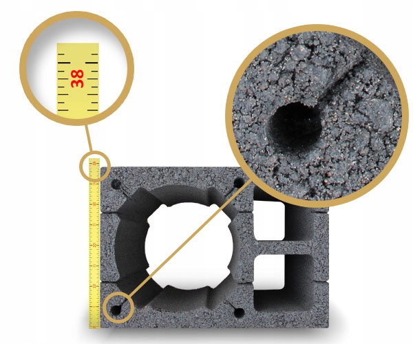 - szerokość pustaka kominowego 38cm (grubsza ścianka 5cm) co w odróżnieniu od pustaków konkurencji zapewnia lepszą izolację oraz stabilność komina