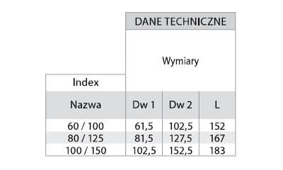 Produkowane są w typoszeregu od DN 50/80 mm do DN 200/350 mm. Wszystkie elementy, które maja kontakt ze spalinami powinny być wykonane z blachy w gatunku 1.4404, 1.4521, lub 1.4301 o grubości 0,4 mm, lub 0,6 mm. Pozostałe elementy mogą być wykonane np. z blachy w gatunku 1.4301, lub 1.4509.