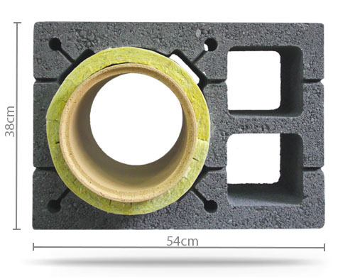 - szerokość pustaka kominowego 38cm (grubsza ścianka 5cm) co w odróżnieniu od pustaków konkurencji zapewnia lepszą izolację oraz stabilność komina