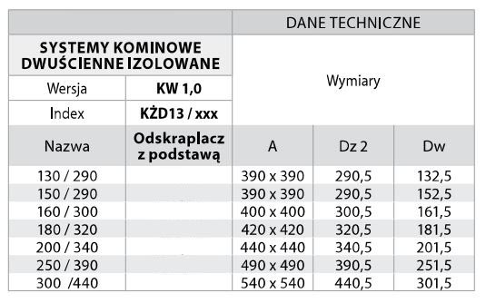 Produkowane są w zakresie srednic od DN130/290 do DN300/440. Wszystkie elementy dwuściennego, żaroodpornego systemu kominowego, które maja kontakt ze spalinami, powinny być wykonane z blachy żaroodpornej w gatunku 1.4828 zgodnie z PN-EN 1856-1:2009, PN-EN 1856-2:2009,