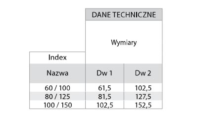 Produkowane są w typoszeregu od DN 50/80 mm do DN 200/350 mm. Wszystkie elementy, które maja kontakt ze spalinami powinny być wykonane z blachy w gatunku 1.4404, 1.4521, lub 1.4301 o grubości 0,4 mm, lub 0,6 mm. Pozostałe elementy mogą być wykonane np. z blachy w gatunku 1.4301, lub 1.4509.