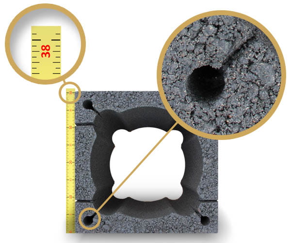 Nasze pustaki kominowe wykonane są z wysokiej jakości keramzytobetonu charakteryzującej się grubością ścianki 50mm. Dzięki szerokim otworom na zbrojenie i większej szerokości pustaka (38cm) niż u konkurencji (grubsza ścianka 5cm), zapewniamy lepszą izolację i stabilność komina.