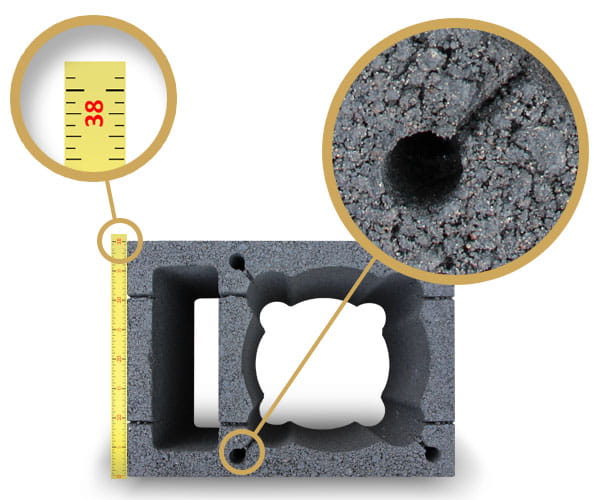 Nasze pustaki kominowe wykonane są z wysokiej jakości keramzytobetonu charakteryzującej się grubością ścianki 50mm. Dzięki szerokim otworom na zbrojenie i większej szerokości pustaka (38cm) niż u konkurencji (grubsza ścianka 5cm), zapewniamy lepszą izolację i stabilność komina.