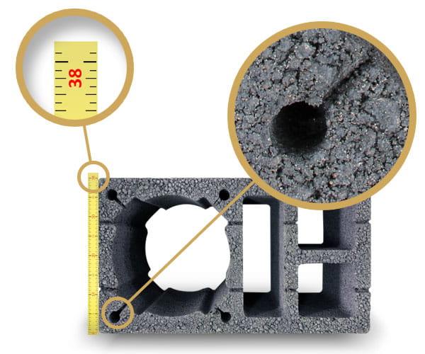 Nasze pustaki kominowe wykonane są z wysokiej jakości keramzytobetonu charakteryzującej się grubością ścianki 50mm. Dzięki szerokim otworom na zbrojenie i większej szerokości pustaka (38cm) niż u konkurencji (grubsza ścianka 5cm), zapewniamy lepszą izolację i stabilność komina.