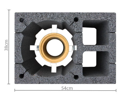 W celu budowy komina ponad dach, w narożnikach bloczka są dodatkowe otwory umożliwiające ułożenie prętów zbrojeniowych.
