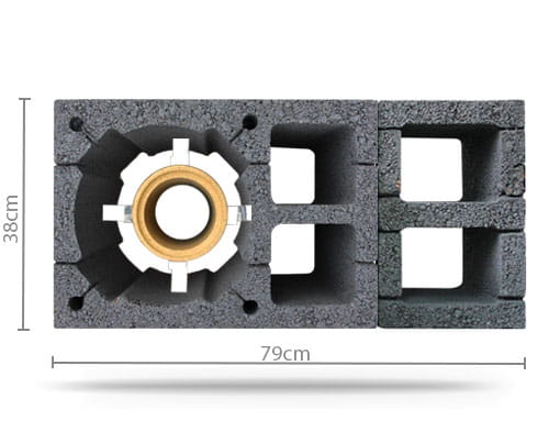 W celu budowy komina ponad dach, w narożnikach bloczka są dodatkowe otwory umożliwiające ułożenie prętów zbrojeniowych.