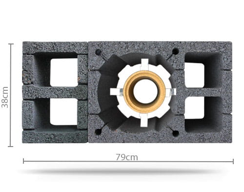 W celu budowy komina ponad dach, w narożnikach bloczka są dodatkowe otwory umożliwiające ułożenie prętów zbrojeniowych.
