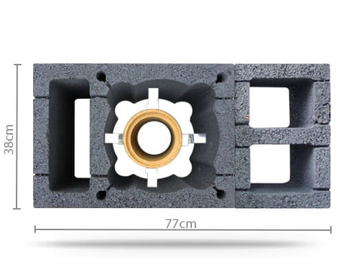 W celu budowy komina ponad dach, w narożnikach bloczka są dodatkowe otwory umożliwiające ułożenie prętów zbrojeniowych.