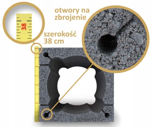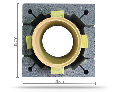- szerokość pustaka kominowego 38cm (grubsza ścianka 5cm) co w odróżnieniu od pustaków konkurencji zapewnia lepszą izolację oraz stabilność komina