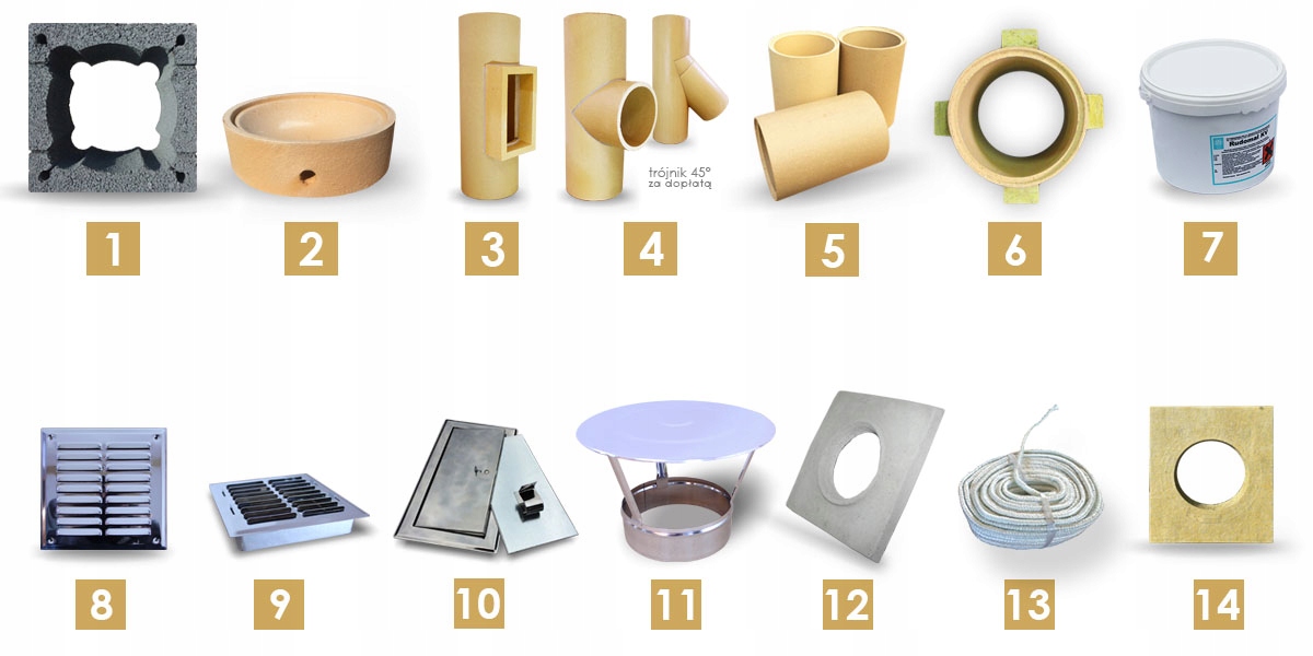 - TRÓJNIK - element umożliwiający podłączenie pieca, kominka do komina. W zestawie trójnik pod kątem 90°. Trójnik pod kątem 45° zamiennie za dopłatą.