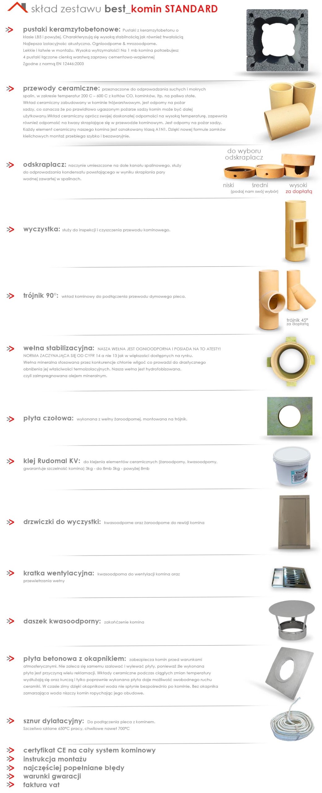 Zestaw zawiera jeden z najlepszych wkładów ceramicznych produkowanych w Europie! Ceramiczne przewody kominowe P-D Refractories A1N1 odporne na pożar sadzy (mają zastosowanie w odprowadzaniu spalin z urządzeń grzewczych opalanych paliwem stałym, gazem lub olejem opałowym w których temperatura spalin dochodzi do 600° C) Jako jedyny przewód kominowy w europie posiada certyfikat na budową o wysokości 50m.