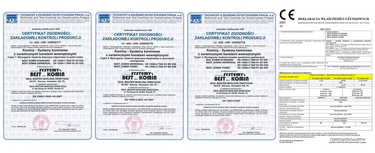 Europejski znak CE na kompletny system kominowy, a nie tylko na poszczególne części składowe. Nasz Komin jest elementem budynku, którego wybór powinien wiązać się ze spełnieniem przez niego określonych warunków. Stateczność czy odporność na kwasy jak zarówno wysoką temperaturę to tylko jedne z nielicznych cech charakteryzujących nasz system. Jego materiały budulcowe pełnią niezwykle ważną rolę i są wykonane z najlepszych surowców. Jako nieliczni w regionie potwierdzamy to partią testów i certyfikatów rok w rok. Certyfikaty dostępne w zakładce "Dokumenty do pobrania"