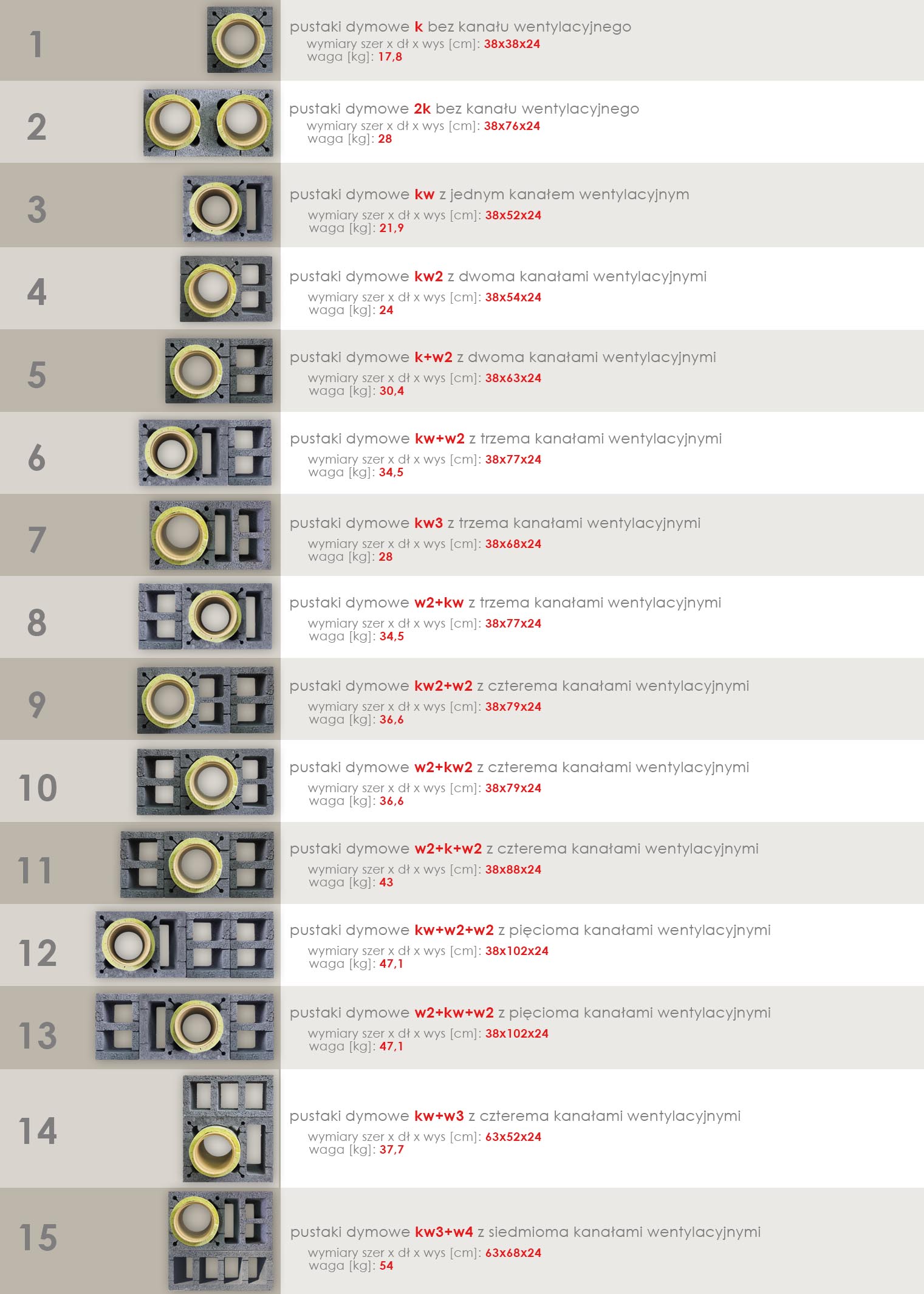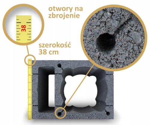 - szerokość pustaka kominowego 38cm (grubsza ścianka 5cm) co w odróżnieniu od pustaków konkurencji zapewnia lepszą izolację oraz stabilność komina