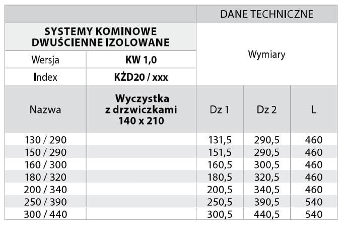 Produkowane są w zakresie srednic od DN130/290 do DN300/440. Wszystkie elementy dwuściennego, żaroodpornego systemu kominowego, które maja kontakt ze spalinami, powinny być wykonane z blachy żaroodpornej w gatunku 1.4828 zgodnie z PN-EN 1856-1:2009, PN-EN 1856-2:2009,